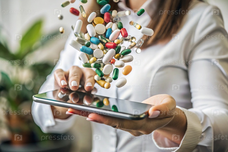 Медикаменты, аптеки, онлайн-заказ, покупка и доставка, консультация у врача в Интернете. Женщина со смартфоном в руке. Красочные планшеты, таблетки и капсулы летают с экрана смартфона