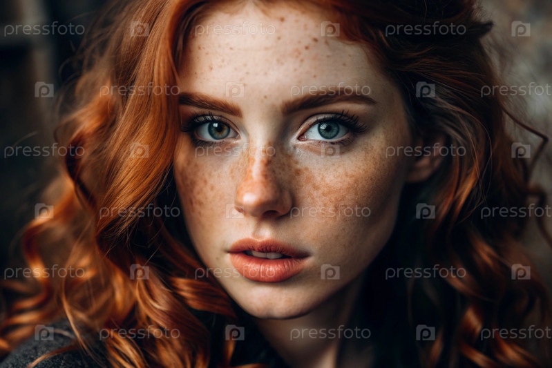 Глубокий эмоциональный портрет.Лицо молодой девушки без макияжа, с выразительными глазами, кудрявыми красными волосами и веснушками на лице. Естественная женская красота