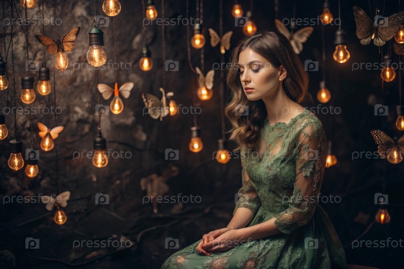 Портрет красивой девушки в зеленом платье среди многих подвешенных лампочек и бабочек, размахивающих вокруг нее