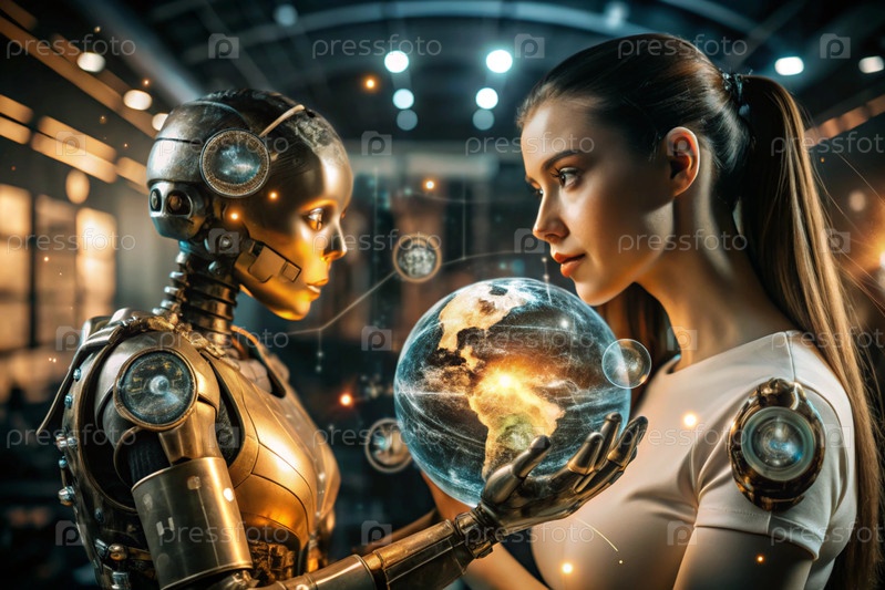 Женщина-киборг с моделью планеты в руке Интеграция технологий и человеческого взаимодействия Производство роботов Искусственный интеллект, Интернет и будущие цифровые технологии