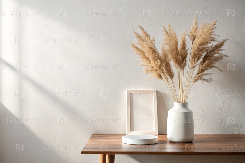 Современная белая керамическая ваза с сухой травой на деревянном столе Скандинавский интерьер Пустая белая стена со тенью из окна