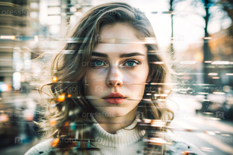 Портрет молодой женщины.Концептуальное искусство Клубовое изображение на фоне города с двойной экспозицией и визуальными эффектами