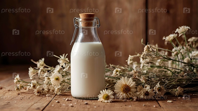 Органическое натуральное овсяное молоко в стеклянной бутылке на стильной деревянной доске и растения.Натуральные, экологически чистые продукты