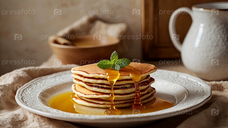 Вкусные блины с медом и листьями мяты на стильной тарелке в бежевой кухне.Концепция российского праздника Масленицы