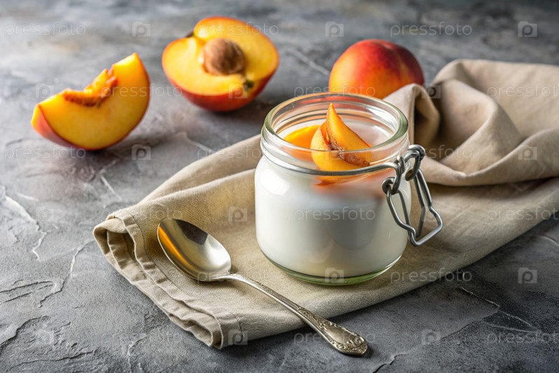 Домашний персиковый йогурт со свежими персиками, винтажной ложкой и полотенцем на стильном сером фоне