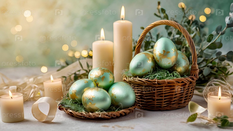 Нежные пасхальные яйца в корзине и зеленые ветви эвкалипта на пастельном аквареле с нежными венами