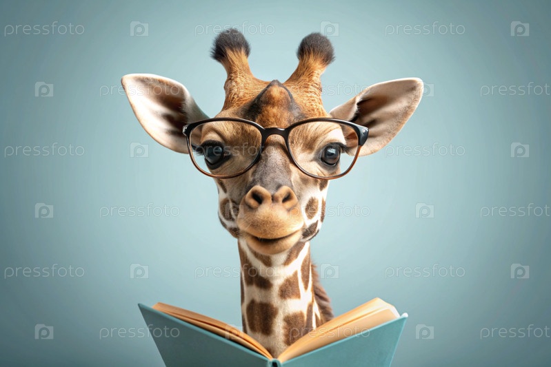 Забавный африканский жираф в очках читает книгу на синем фоне