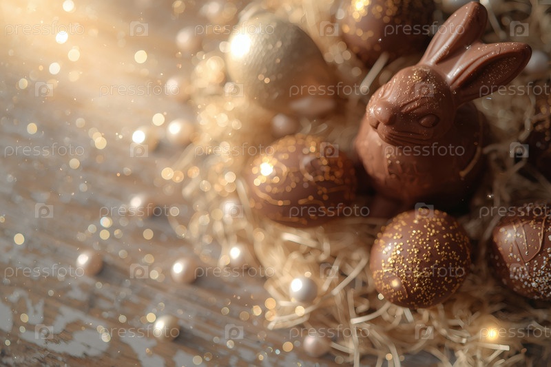 Концепция ярких пасхальных праздников в 2026 году. Красивая открытка. Баннер. Шоколадные пасхальные яйца и шоколадное зайцо на деревянном фоне. Пасхальные сладости и лакомства