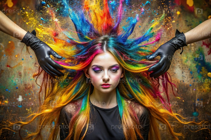 Творческий баннер для салона красоты или парикмахера. Модное профессиональное окрашивание волос. Красивая молодая девушка-подросток с длинными многоцветными волосами. Взрыв цветов на голове