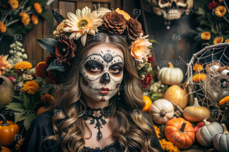 Концепция Хэллоуина. Ужасно. Костюмированная вечеринка. Красивая женщина с покрашенным черепом на лице и цветами на голове. Баннер, открытка