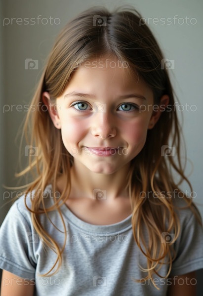 Веселая молодая девушка с длинными, гладкими волосами тепло улыбается камере, ее сияющие глаза отражают солнечный свет в спокойной обстановке в комнате, наполненной мягкими оттенками