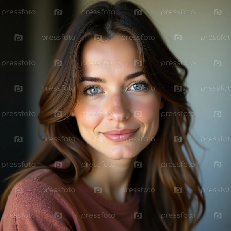 Молодая женщина с красивыми зелеными глазами и сияющей улыбкой сидит в мягко освещенной обстановке в комнате.Ее спокойное поведение и теплое выражение лица создают привлекательную, возвышающую атмосферу