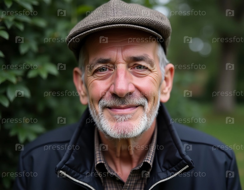 Пожилой человек, одетый в обычное пальто и шапку из бревен с радостью.Он стоит в пышном зеленом парке, излучая тепло и счастье, наслаждаясь спокойным днем