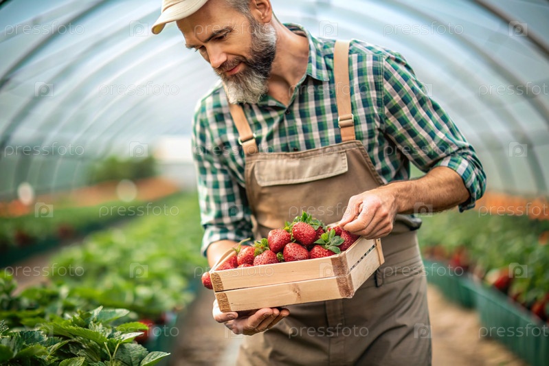 Сельскохозяйственная промышленность. деревянный ящик со клубниками в руках фермера-мужчины. садовник собирает богатый урожай в теплице