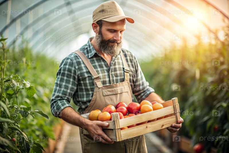 Сельскохозяйственная промышленность. деревянный ящик с помидорами в руках фермера-мужчины. садовник собирает богатый урожай в теплице