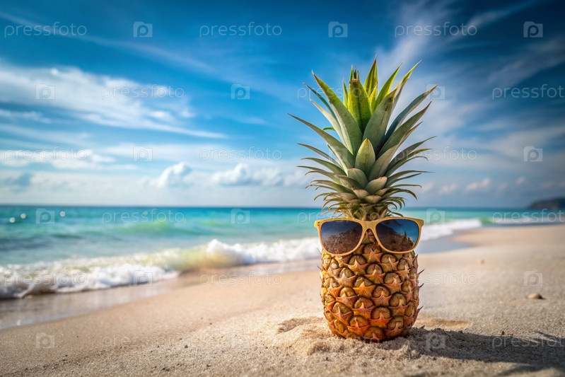 Понятие отдыха и путешествий. Ананас в солнцезащитных очках на пляже тропического моря или океана на фоне голубой воды и неба. Место для текста