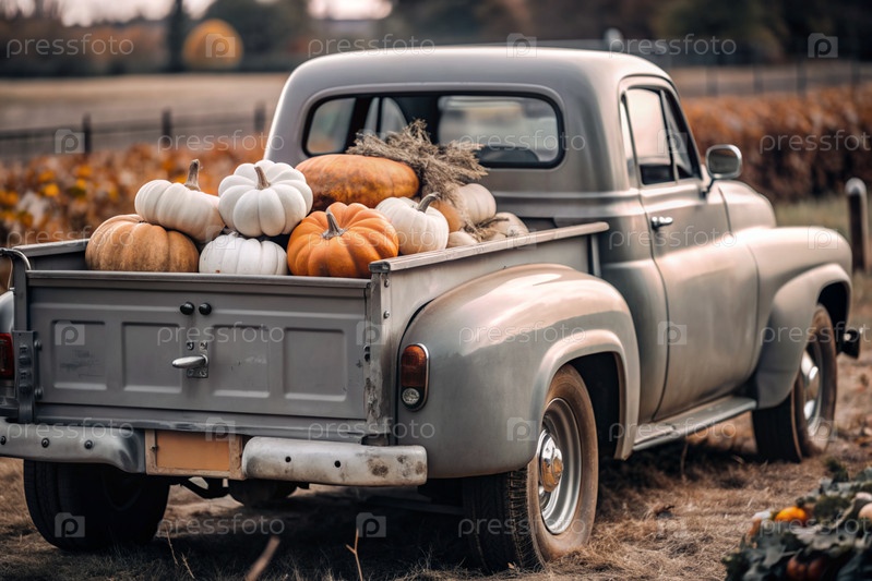 Осень, осенний дизайн.Большой урожай тыквы на заднем сиденье ретро-пикапа, крупный план