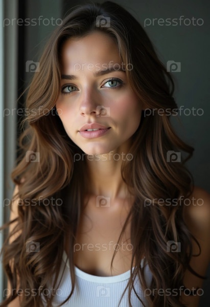 Молодая женщина с коричневыми волосами и ярко-зелеными глазами задумчиво смотрит в сторону камеры.Мягкий свет улучшает ее естественную красоту в привлекательном, интимном пространстве