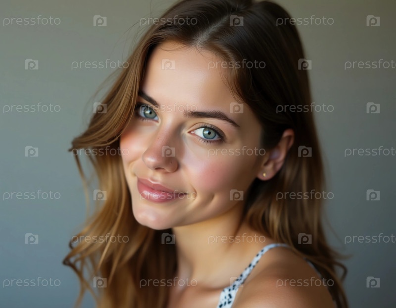 Мягкий свет раскрывает красоту молодой женщины с очаровательными голубыми глазами и теплой улыбкой.Ее распущенные волосы обрамляют ее лицо, вызывая спокойную и привлекательную атмосферу на фоне генеративного ИИ