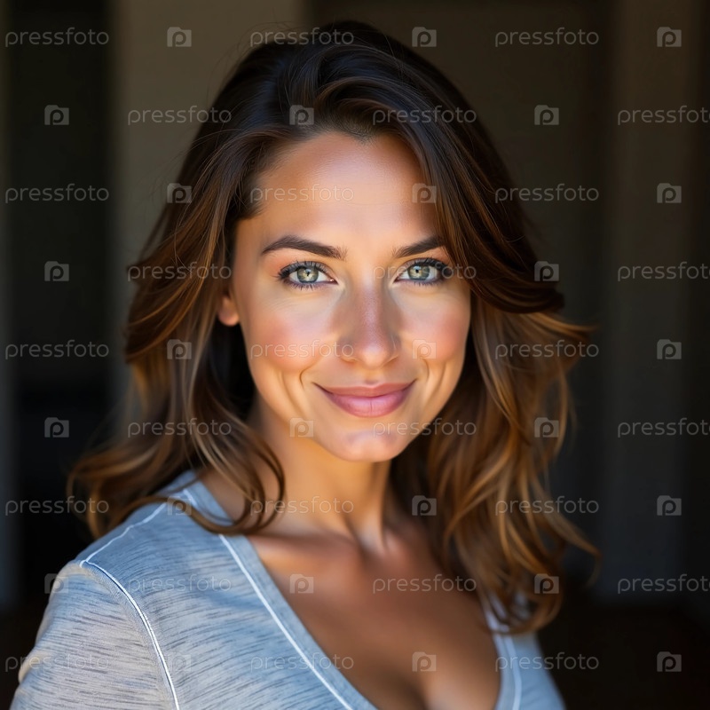 Уверенная в себе молодая женщина стоит на фоне мягко освещенного фона, ее теплая улыбка и сияющие глаза улавливают сущность красоты и уравновешенности