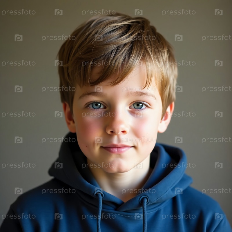 Молодой мальчик с ярко-синими глазами выглядит вдумчиво, одетый в уютную Generative AI свитер