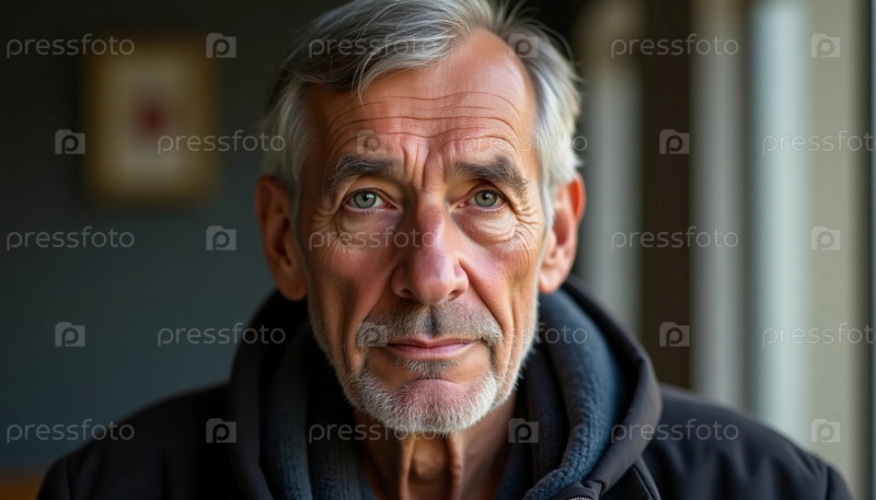Пожилой мужчина стоит под мягким естественным светом, мыслящим взглядом за окном.Его лицо отражает жизненные переживания, вызывая чувство глубокого созерцания и мудрости