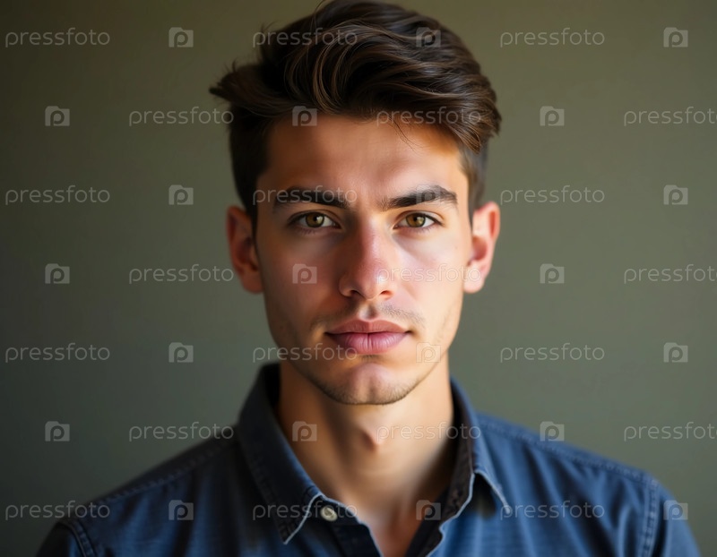 Молодой человек уверенно смотрит на зрителя, его черты лица освещены мягким светом, который улучшает его яркий внешний вид