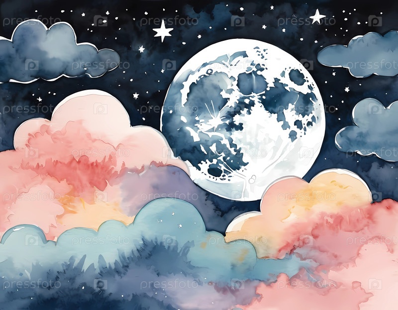 Исследуйте очаровательное ночное небо, украшенное светящейся луной, вихревыми облаками и мерцающими звездами в этом шедевре генеративного искусственного интеллекта