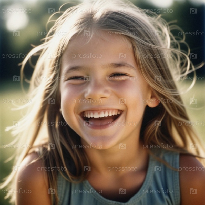 Портрет красивой смеющейся девушки с длинными светлыми волосами. Счастливое детство на свежем воздухе. Искусственный интеллект, созданный искусственным человеком. Скандинавский житель, финский, норвежский, шведский, балтийский тип лица