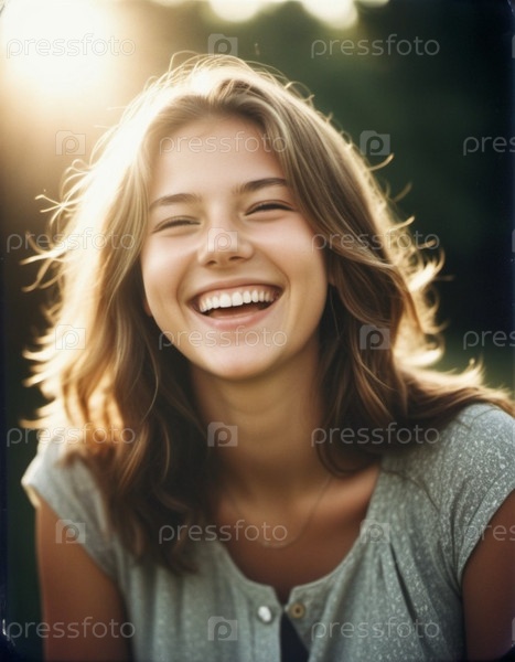 Портрет красивой смеющейся блондинки с прямыми волосами и белыми зубами. Солнечная погода. Сгенерированный ИИ. Жительница скандинавского, финского, норвежского, шведского, балтийского типа лица