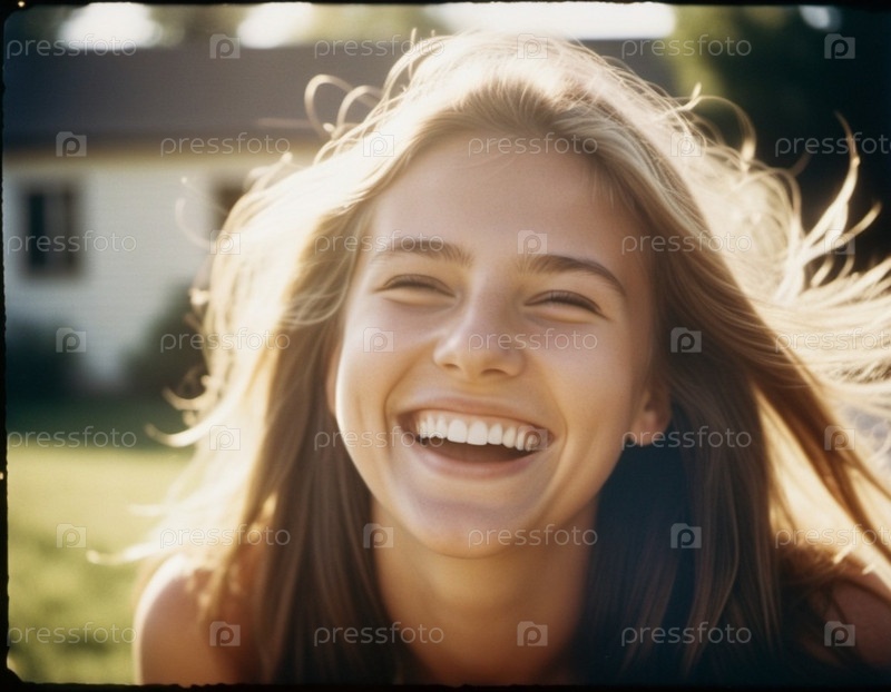 Портрет красивой смеющейся блондинки с прямыми волосами и белыми зубами. Солнечная погода. Сгенерированный ИИ. Жительница скандинавского, финского, норвежского, шведского, балтийского типа лица