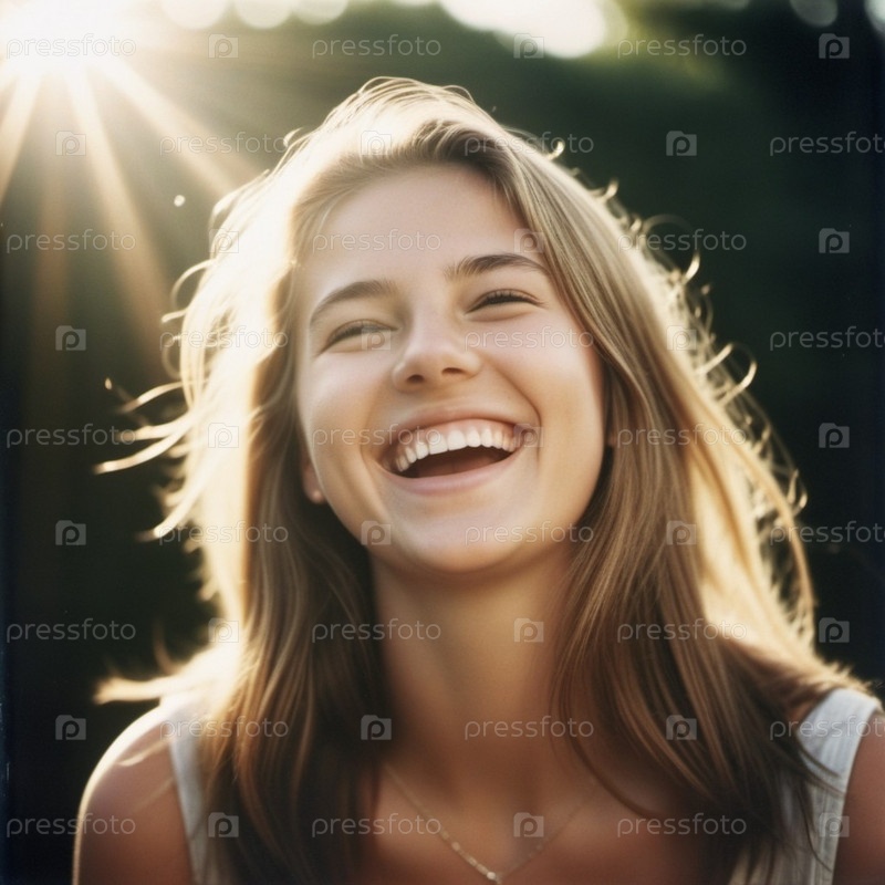 Портрет красивой смеющейся блондинки с прямыми волосами и белыми зубами. Солнечная погода. Сгенерированный ИИ. Жительница скандинавского, финского, норвежского, шведского, балтийского типа лица