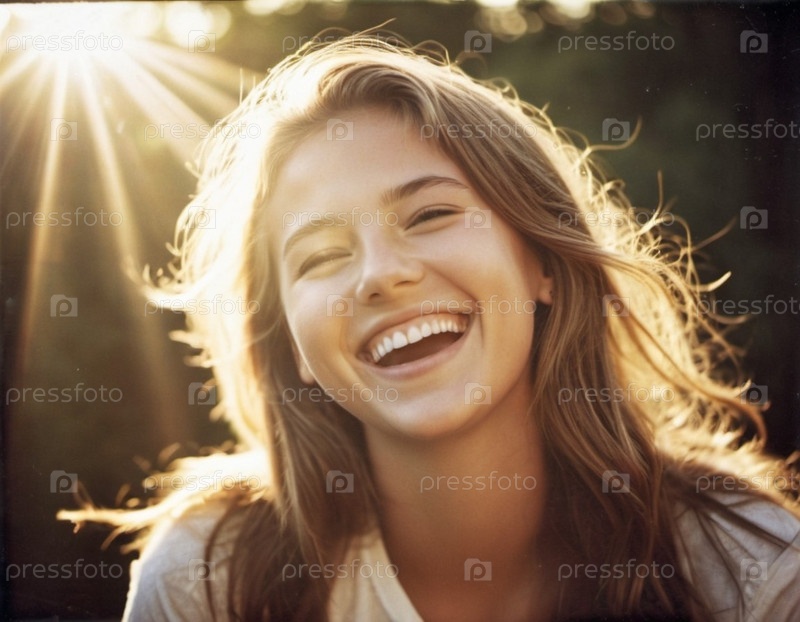 Портрет красивой смеющейся блондинки с прямыми волосами и белыми зубами. Солнечная погода. Сгенерированный ИИ. Жительница скандинавского, финского, норвежского, шведского, балтийского типа лица