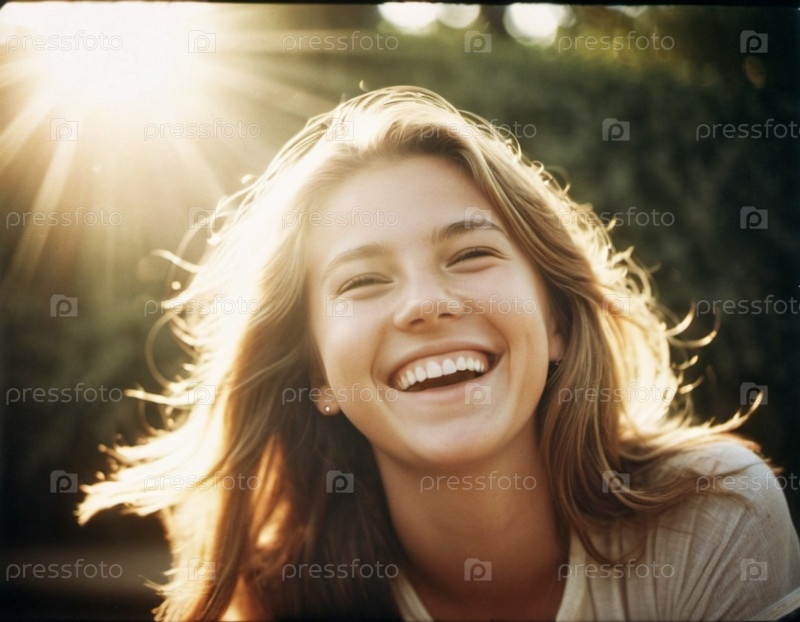 Портрет красивой смеющейся блондинки с прямыми волосами и белыми зубами. Солнечная погода. Сгенерированный ИИ. Жительница скандинавского, финского, норвежского, шведского, балтийского типа лица