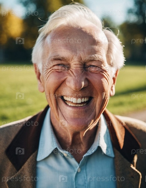 Портрет счастливого старика с белыми волосами, улыбающегося на улице. На фоне размытое изображение деревьев. Веселый активный пенсионер. Весёлый хороший дед. Белые зубы, морщины на лице и шее