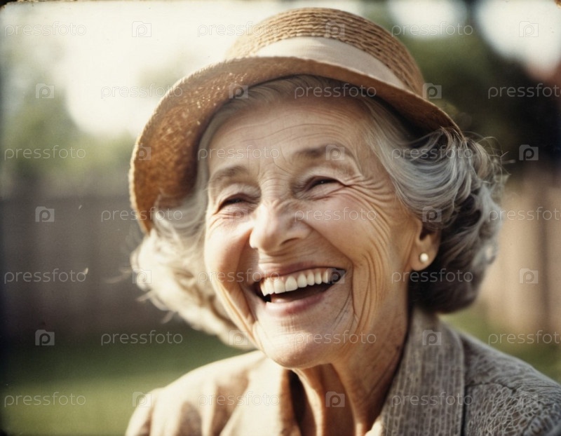 Пожилая женщина с белыми волосами, широко улыбающаяся. Она смотрит вверх. Старушка со скандинавским лицом. Седые волосы, белые зубы. Веселая, активная пенсионерка. Сгенерированный ИИ