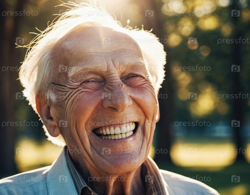 Портрет счастливого старика с белыми волосами, улыбающегося на улице. На фоне размытое изображение деревьев. Веселый активный пенсионер. Весёлый хороший дед. Белые зубы, морщины на лице и шее