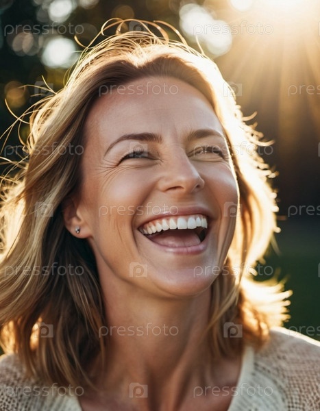 Портрет смеющейся красавицы коричневой женщины средних лет с прямыми волосами и белыми зубами Солнечная погода Радость от счастья Положительные эмоции Скандинавский тип лица
