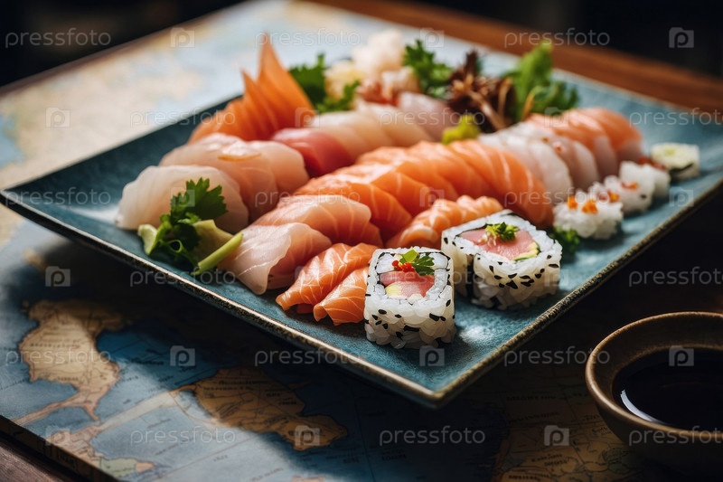 Японское блюдо сашими суши рыба на карте, открытка Всемирный день продовольствия AI Generative