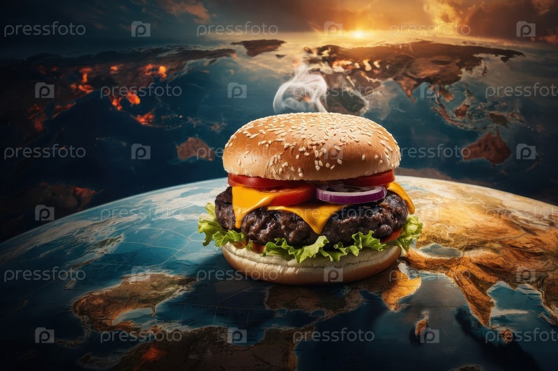 Сочный свежий американский гамбургер на карте, открытка Всемирного дня продовольствия