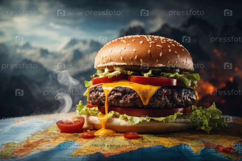 Сочный свежий американский гамбургер на карте, открытка Всемирного дня продовольствия