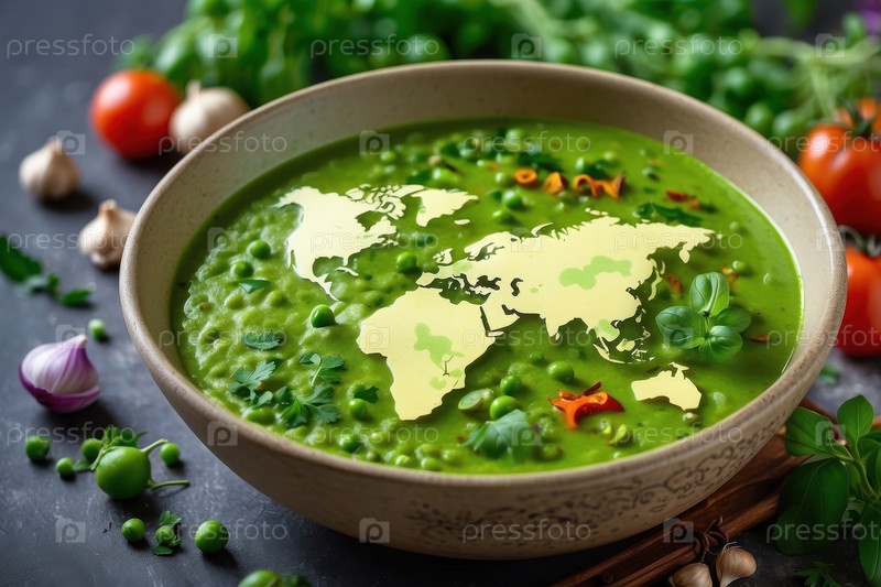 Карта на вершине зеленого овощного супа, открытка Всемирный день продовольствия AI Generative