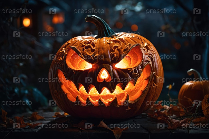 Тыквенный фонарь на ужасном фоне, атрибут осенних праздников Хэллоуина