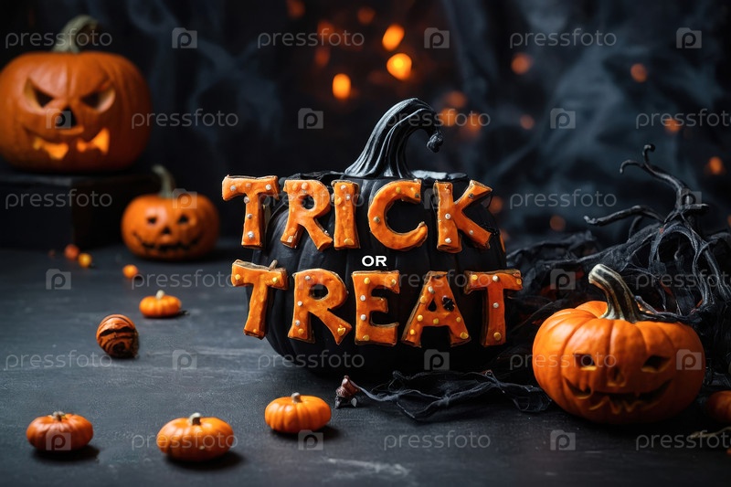 AI Generative Festive Halloween Card Trick or Treat на темном фоне с тыквой, шляпой и битой