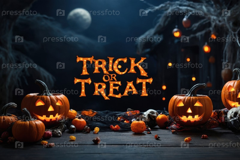 AI Generative Festive Halloween Card Trick or Treat на темном фоне с тыквой, шляпой и битой