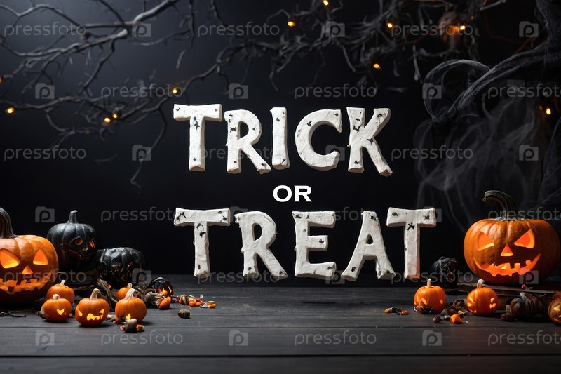 AI Generative Festive Halloween Card Trick or Treat на темном фоне с тыквой, шляпой и битой