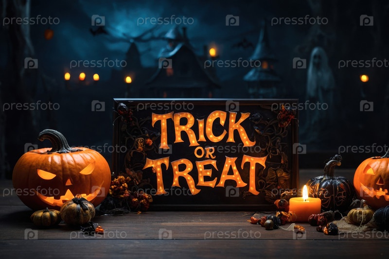 AI Generative Festive Halloween Card Trick or Treat на темном фоне с тыквой, шляпой и битой