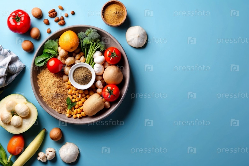 Фон плоская еда синий фон, открытка Всемирный день продовольствия AI Generative