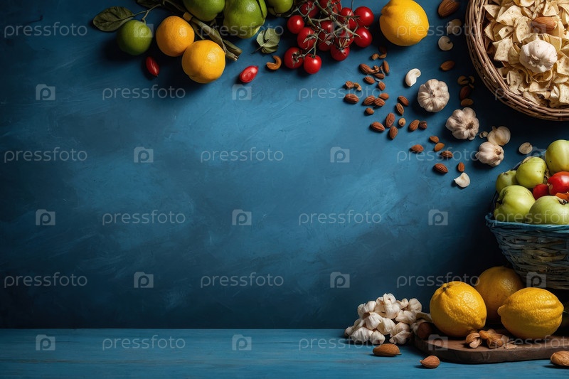 Фон плоская еда синий фон, открытка Всемирный день продовольствия AI Generative