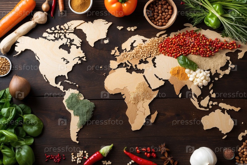 Плоская карта мира специй и овощей, открытка Всемирный день продовольствия AI Generative